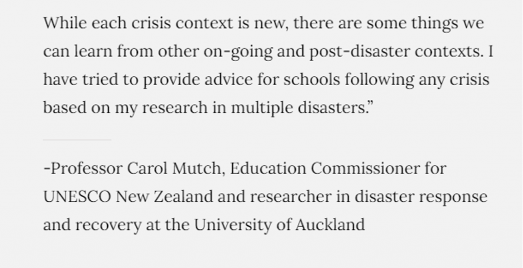 The introductory video on this site, by Professor Carol Mutch, includes clarification 0f where our focus needs to be, following traumatic incidents. The video (from 5:10) addresses teachers in particular.